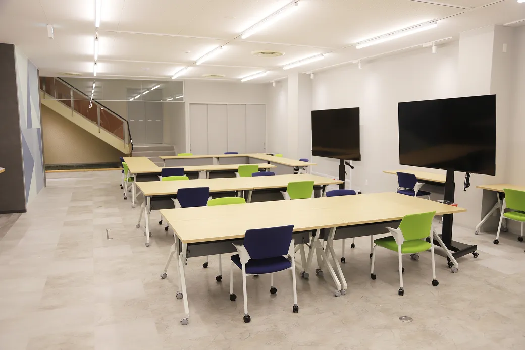 通常時はコワーキングスペースとしてご利用いただけます。イベント開催時には、最大75人を収容可能なイベントスペースとして機能。入居企業だけでなく市民や学生・行政職員も訪れる、交流の拠点を象徴するフロアです。
